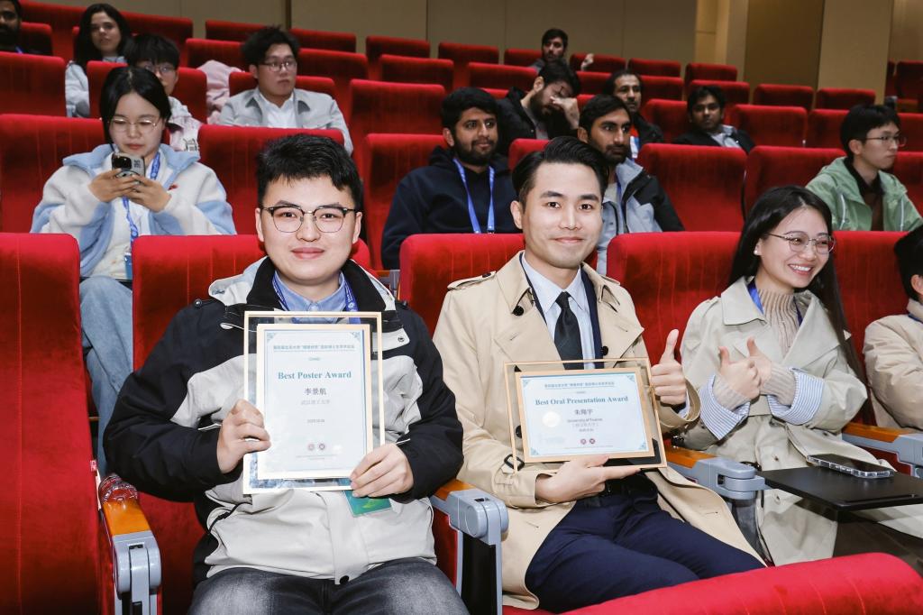 在随后举行的颁奖仪式上,经评审组严格评审,共评选出25项优秀海报奖与20项优秀报告奖,与会专家、领导为获奖学生颁发证书并合影。
