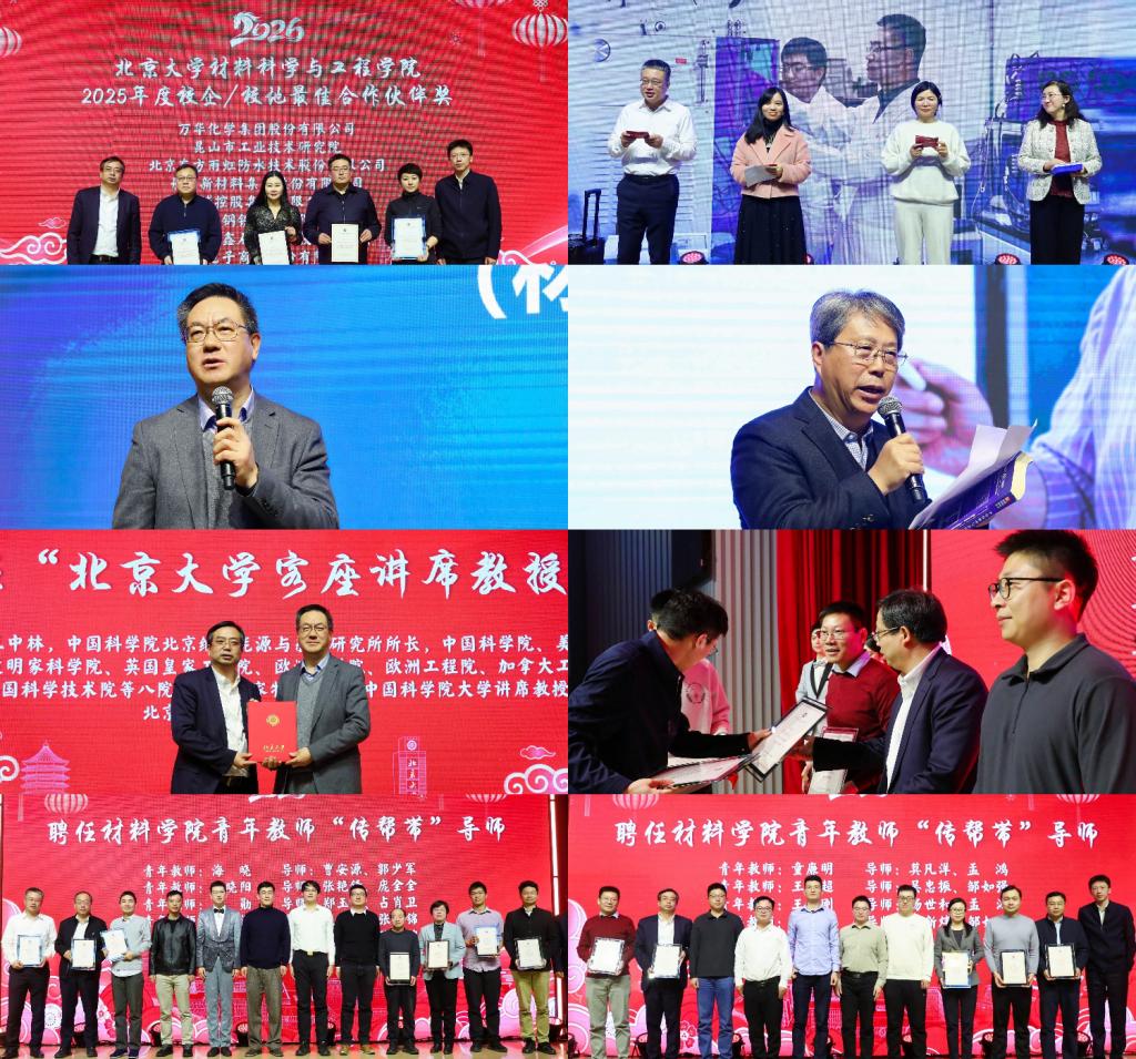 随后,学院颁发了2025年度校企/校地最佳合作伙伴奖,并对年度杰出教师与课题组进行了表彰。北京大学材料系首任系主任王中林院士,学院退休教师董蜀湘,学院教师代表,院友代表和在校生代表共同开展《真材实料、廿载华章》主题讲述,深情回顾与材料学院同行的历程,抒发科技报国的情怀。同时,学院正式聘任王中林院士为北京大学客座讲席教授,聘任黄友元总经理为北京大学深圳研究生院客座教授,并举办第三期青年教师与导师“传帮带”结对仪式。