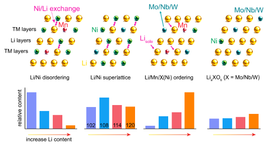 潘锋教授与德国卡尔斯鲁厄理工学院Helmut Ehrenberg教授和Sylvio Indris研究员研究团队合作采用多种锂敏感表征技术,包括中子衍射和锂同位素固态核磁共振等,深入分析了高镍正极材料中不同锂位的占据情况及其相关结构组分。研究发现,通过引入高价态掺杂元素(如Mo6+、Nb5+和W6+)并调整合成过程中的锂盐用量,可以有效调控材料中不同含锂结构组分的比例,进而优化材料的电化学性能。研究结果显示,随着材料中锂含量的增加,材料中锂/镍交换缺陷逐渐减少,而富锂结构单元(如LiaXOb和Li/Mn/X(Ni)有序相,X=Mo, Ni, W)逐渐增加。这两种结构单元通过抑制锂/镍交换和引入额外氧的氧化还原机制,显著提高了高镍正极材料的循环稳定性。该研究成果不仅为深入理解高镍正极材料的锂占位机制提供了新的视角,也为开发高性能无钴高镍正极材料提供了重要的理论指导。相关研究成果以“Tuning Li occupancy and local structures for advanced Co-free Ni-rich positive electrodes”为题,发表于国际知名期刊《Nature Communications》(自然通讯)(DOI: 10.1038/s41467-025-57063-7)。