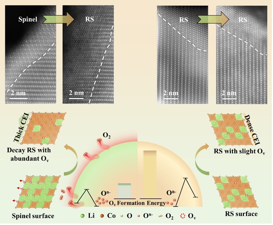 图1. LCO表面尖晶石相与表面岩盐相中晶格氧在长效循环中的演化机制