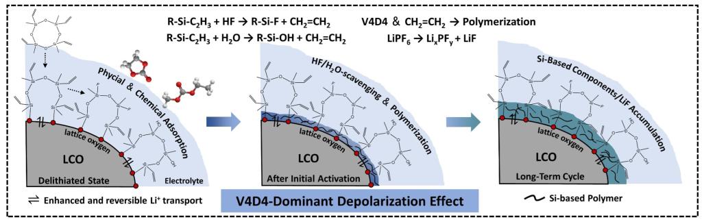 近日,北京大学潘锋教授团队联合清华大学柳明副教授团队,从电化学界面原位重构的角度出发,通过在电解液中引入环状有机硅氧烷添加剂2,4,6,8-四甲基-2,4,6,8-四乙烯基环四硅氧烷(V4D4),并协同氟代碳酸乙烯酯(FEC),成功构建了具有优异离子电导率和结构稳定性的界面固态电解质膜(CEI)层。该CEI层显著提升了LCO在4.55 V截止电压下的循环稳定性和容量释放能力(图1)。机理研究表明,V4D4添加剂在电化学过程中与高脱锂态钴酸锂表面形成原子尺度的界面键合与重构,不仅能有效原位清除有害物质HF/H₂O,还能通过开环聚合反应构建富含硅基聚合物组分的CEI层。该界面层具备优异的离子电导率和显著的去极化效应,使钴酸锂正极在4.55 V高电压下实现了220 mAhg-1的超高放电容量,并展现出卓越的循环稳定性和相变可逆性,在200次循环后容量保持率高达97%。相关研究成果以“Additive-regulated interface chemistry enables depolarization for ultra-high capacity LiCoO2”为题,发表于能源材料领域顶级期刊《先进材料》(Advanced Materials,DOI: 10.1002/adma.202504106, 影响因子26.8)。